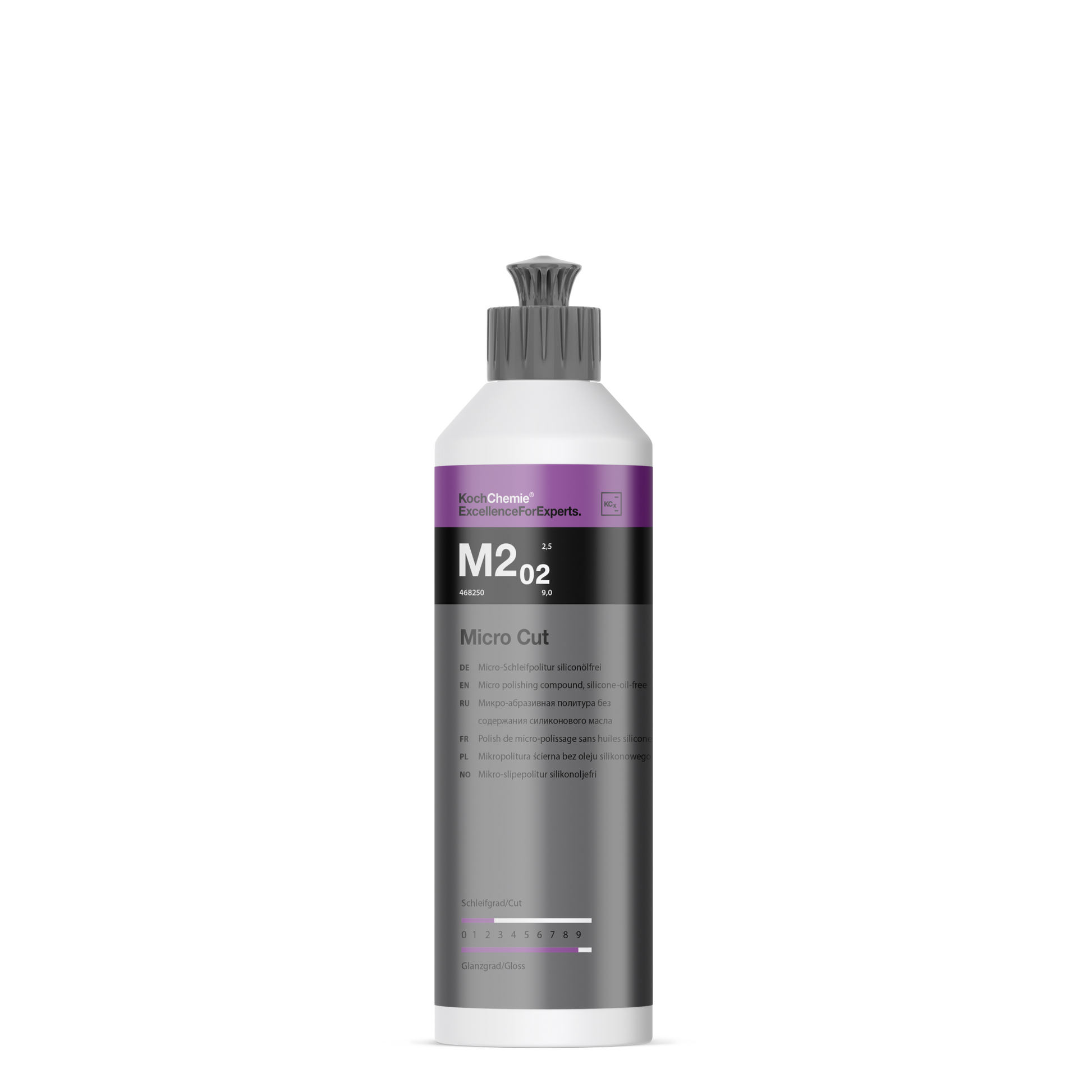 Micro Cut M2.02 is a machine micro-polishing agent of the latest generation for the permanent removal of polishing haze, holograms, fine scratches and sanding from 4,000 grit on all (including scratch-resistant) paint systems.