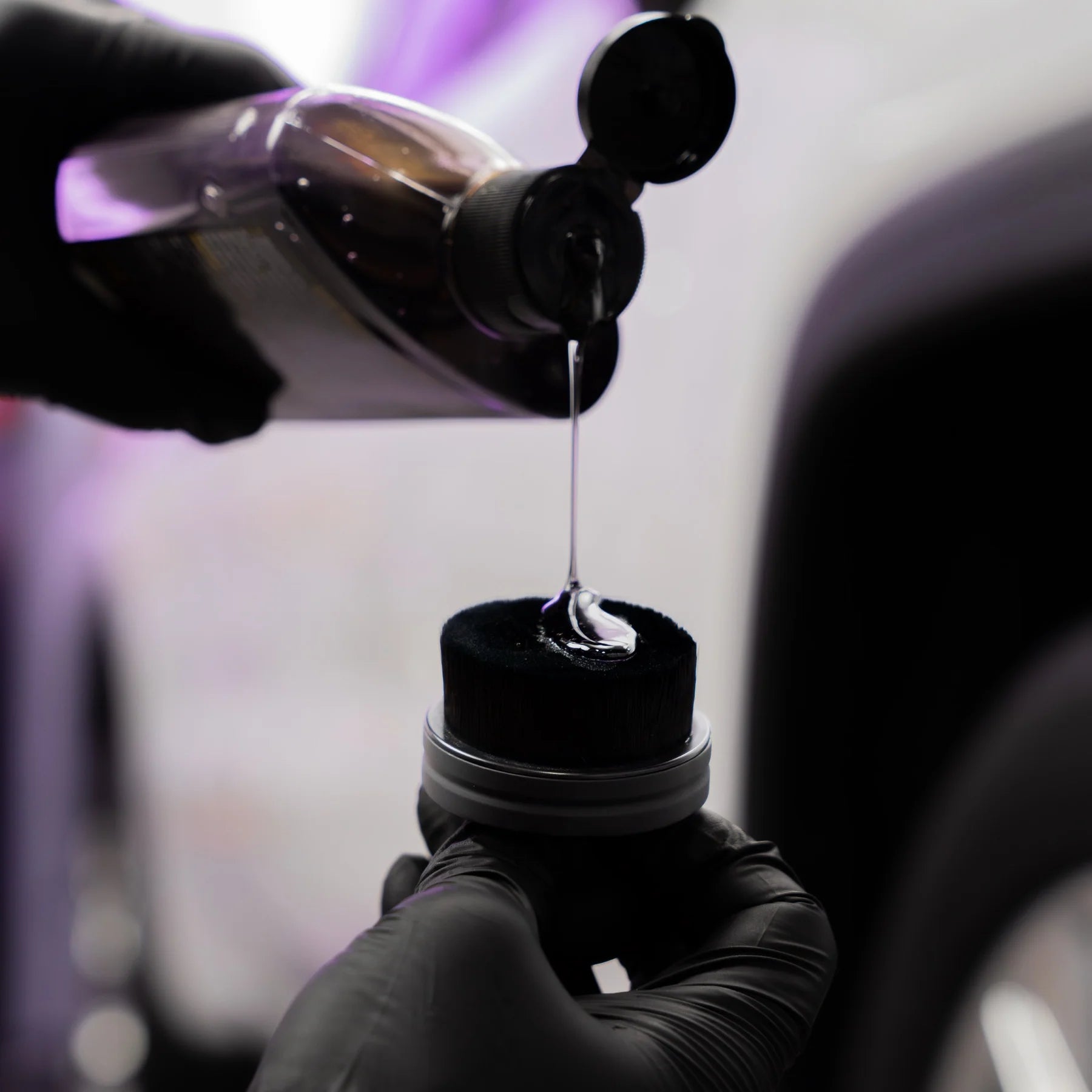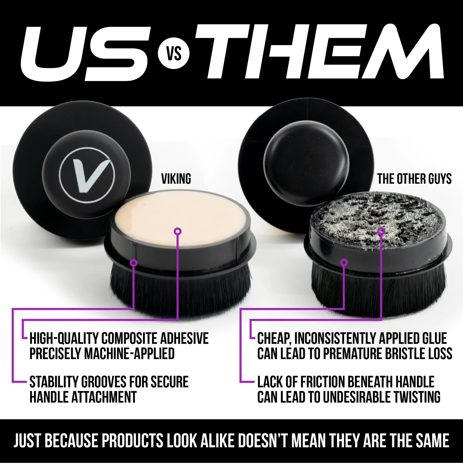The VIKING Tire Shine Applicator Brush features ultra-soft bristles that effortlessly glide over lettering and raised designs for a smooth and even application. The densely packed bristles ensure optimal transfer of gels, dressings, and protectants. The compact size works great on all tire profiles and provides a professional tire dressing experience. The included stand is perfect for storing the applicator brush and protecting the bristles when not in use.